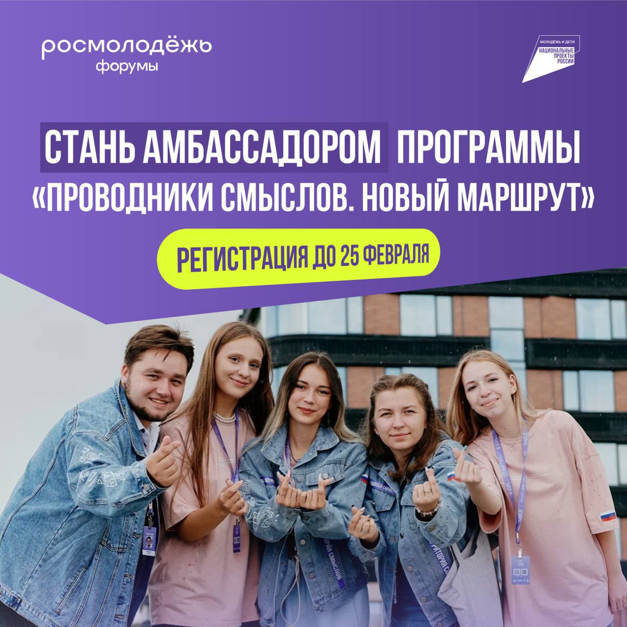Твой путь может стать навигатором для тысяч других. Становись участником амбассадорской программы «Проводники смыслов. Новый маршрут» и рассказывай о возможностях молодёжной политики студентам и школьникам со всей страны!